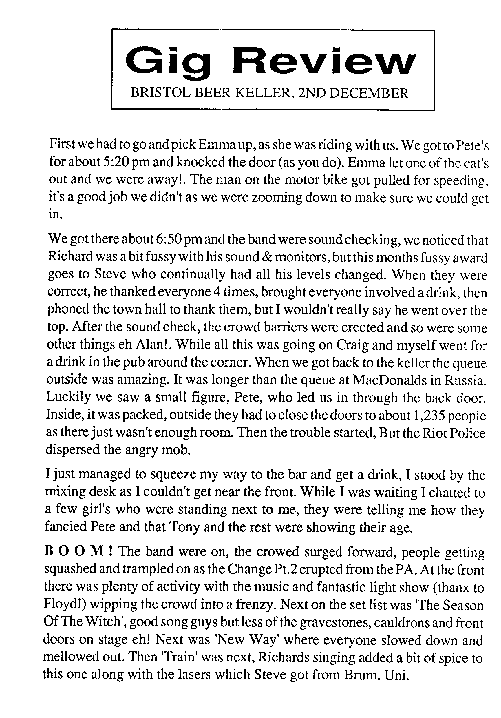 [Barbie's Note: I remember this gig very well, as the afternoon was spent trapsing round Bristol trying to find a chip shop. The light show was provided by yours truly, and unfortunately we had to use the lighting rig provided by the Bierkeller, as we didn't enough money to bring our at the time. The control board was on the stage left pillar beside the PA stack. So consequently I had to stand on beer crates with the PA blasting in one ear and Steve's amp blasting in the other. In all in all through it was a good night, and much ale was quafted before we went home.]