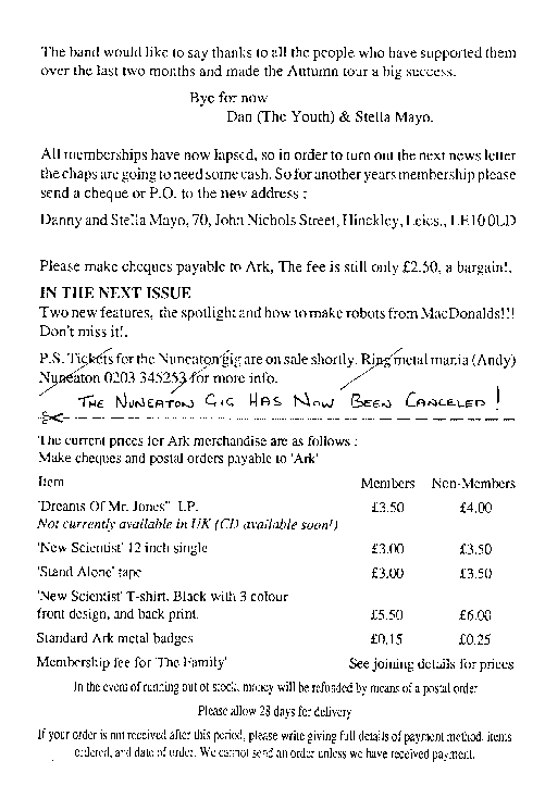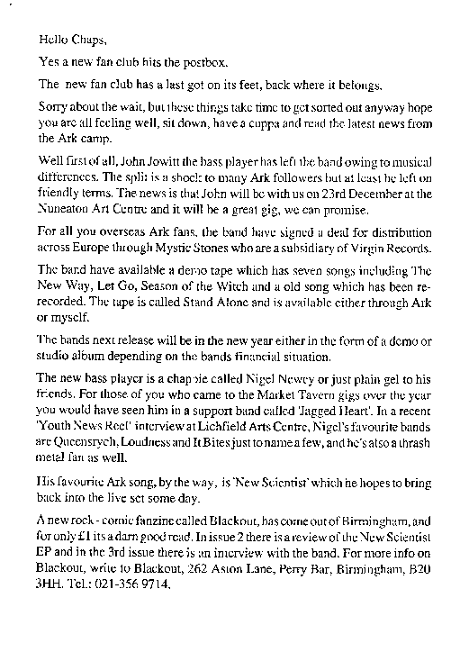 Danny did a great job getting the fan club moving again, and helped to generate alot of interest in the band again with those fans who had thought they'd split, having not heard from anyone for ages. The band themselves were wondering what was happening next too... especially as John left a few months before the new newsletter hit the streets.
